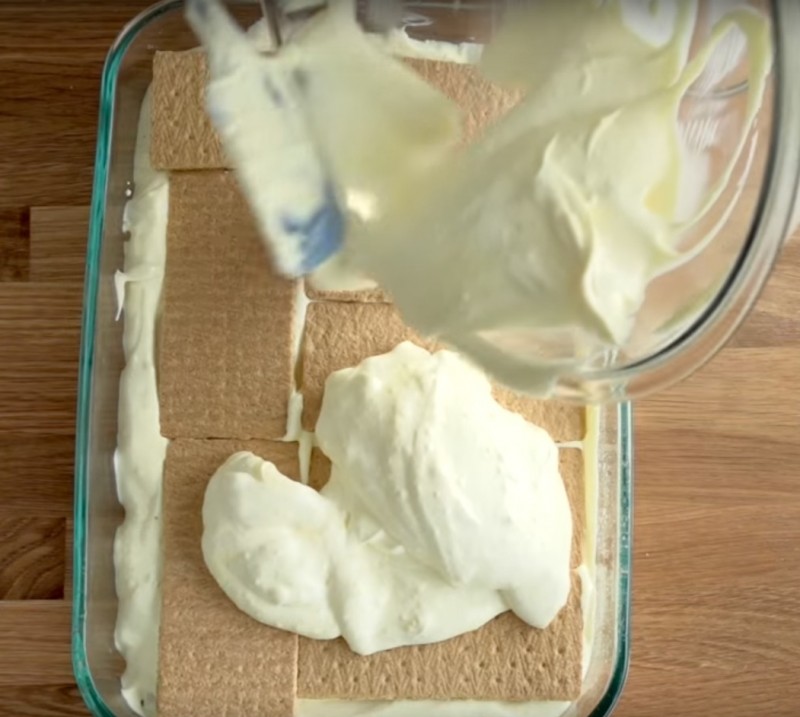 Eine große Auflaufform mit den Keksen auslegen. Auf diesem Bild sehen wir Graham Cracker. Die gibt es zwar auch hier zu kaufen, aber sie sind als Importware sehr teuer. Alternativ empfehlen sich besagte Vollkornbutterkekse.