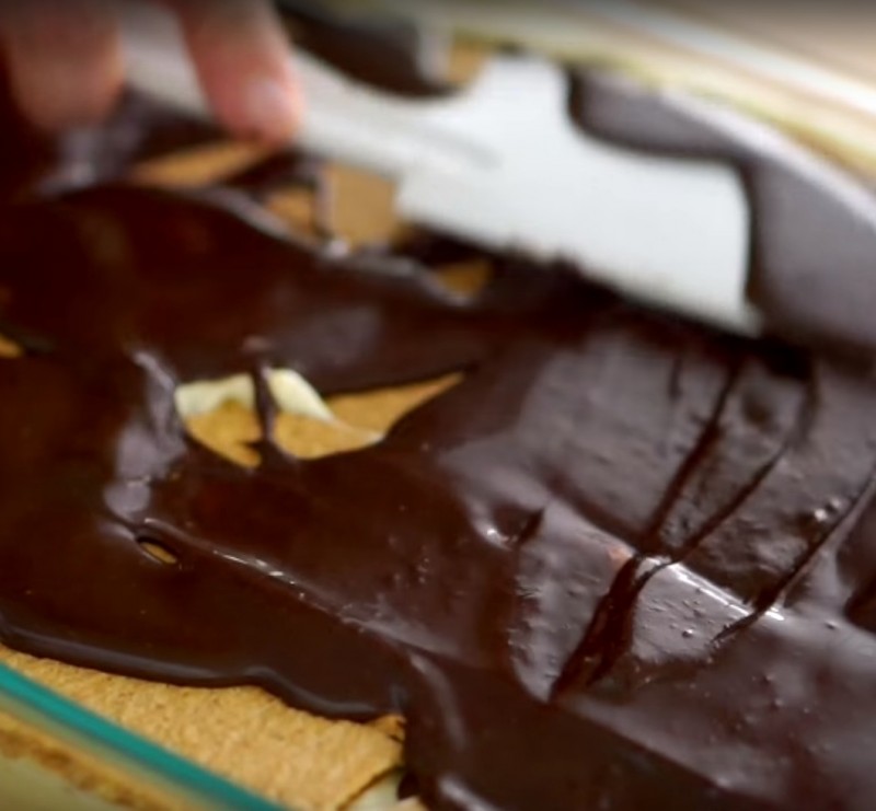 Über das Ganze geben und mit einem Löffel oder Teigschaber gut verteilen. Dann ab damit in den Kühlschrank (für mind. 6 Stunden, besser über Nacht).