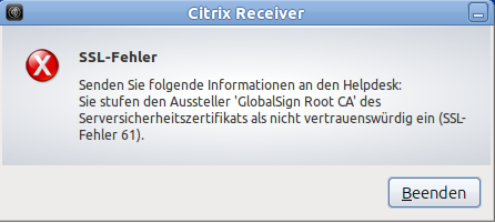 Das bedeutet, dass hier Sicherheitszertifikate im Citrix-Client fehlen.