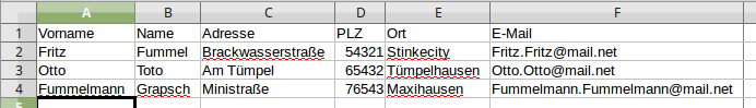 Als erstes müssen wir eine Tabelle mit den Adressdaten erstellen, in der jedes Adressfeld eine eigene Spalte bekommt: