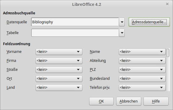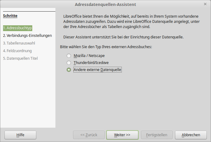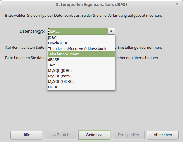 Mit "LibreOffice-Base" können auch diverse andere Adressbuchquellen eingebunden werden, wie z.B. Tabellendokumente oder das ThunderBird-Adressbuch.
