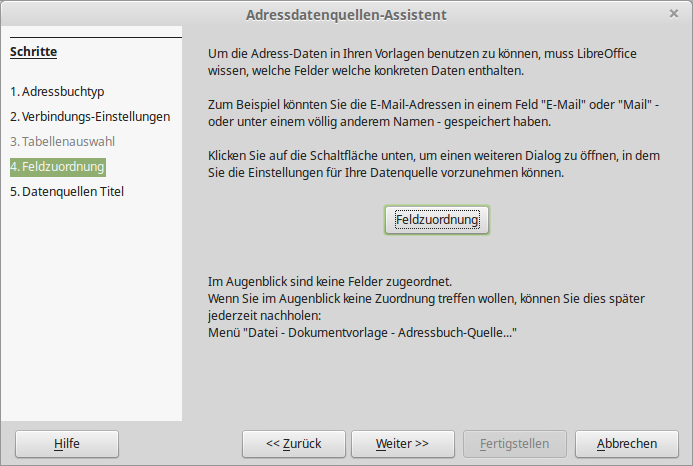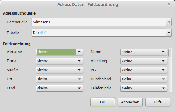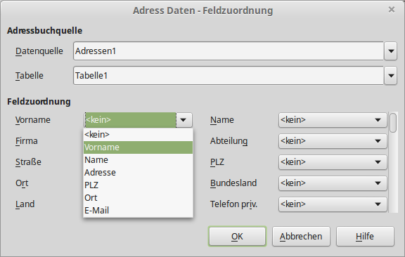 wir haben jetzt folgende Feldnamen zur Auswahl, denen jeweils eine Spalte aus dem Tabellendokument (alle Felder müssen nicht zugewiesen werden) zugewiesen werden kann: