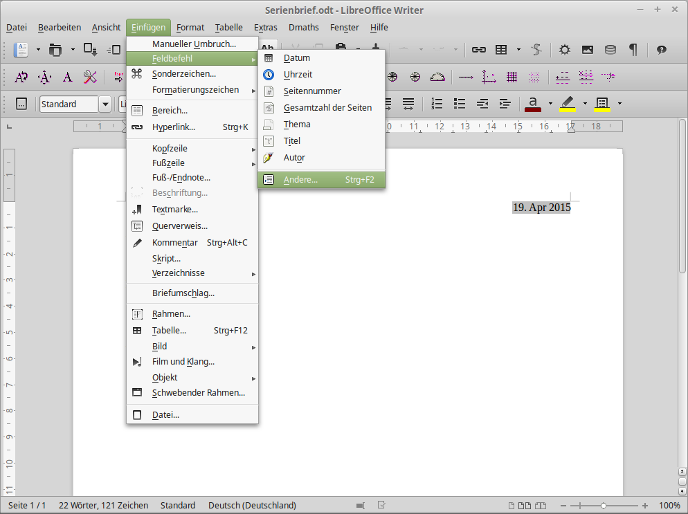 Nach der Installation von LibreOffice-Base haben wir in LibreOffice-Writer unter "Extras" zwei neue Menü-Punkte:
