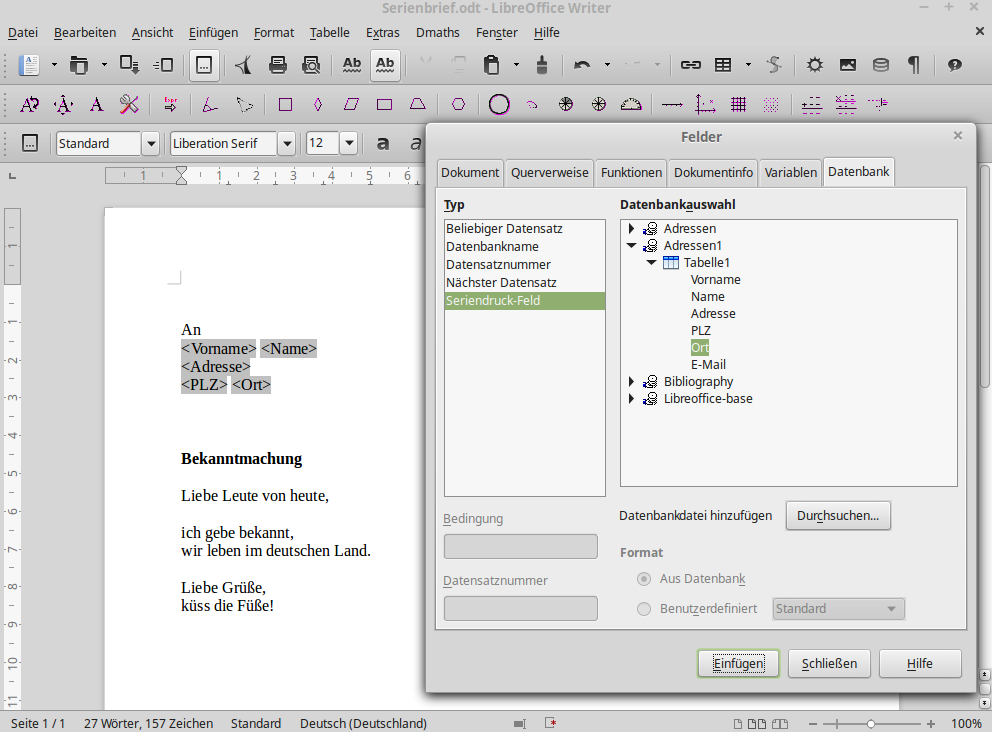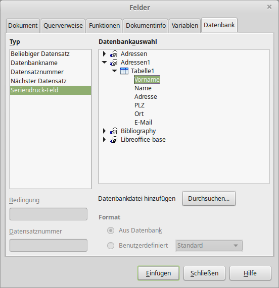 unter "Seriendruck-Feld" kann man die Datenbank (in unserem Fall ist es ein Tabellendokument) auswählen und darin auch die Felder (Spalten) einsehen: