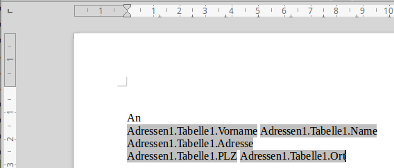 auf dem Serienbrief kann man die Feldbefehle sehen, in unserem Beispiel sind haben wir daraus die Adresse des Empfängers zusammen gebaut: