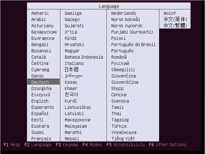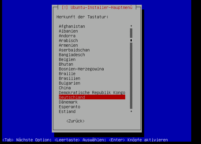 Hier wird die Sprache für das Ubuntu-Installations-Hauptmenü ausgewählt… verstehe ich zwar nicht, da wir das schon als aller erstes gemacht haben aber wenn Ubuntu das so will, dann müssen wir das so machen…