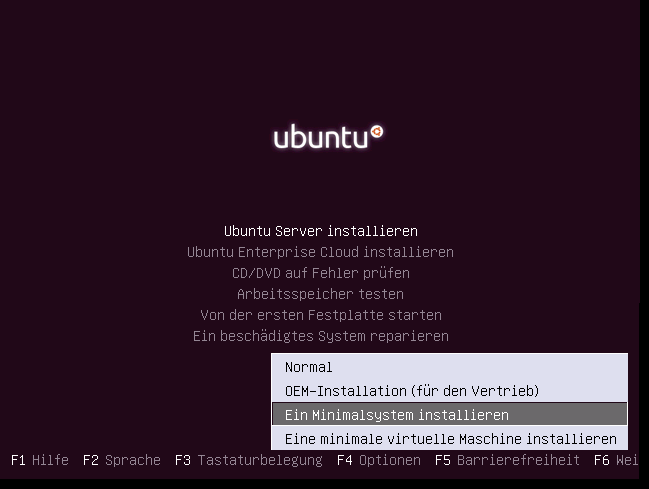 Der einzige Unterschied zwischen der Standardinstallation und der Minimalinstallation ist der, das man vor dem Installationsstart im Startmenü mit "[F4]" an Stelle von "Normal", den Menüpunkt "Ein Minimalsystem installieren" auswählt: