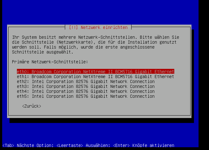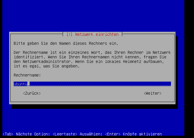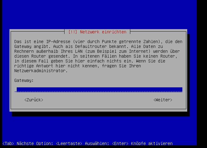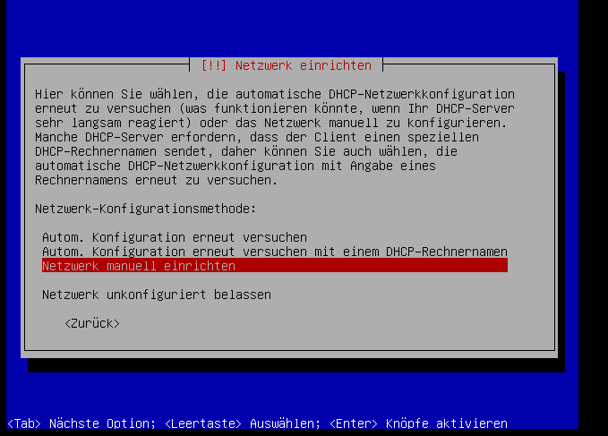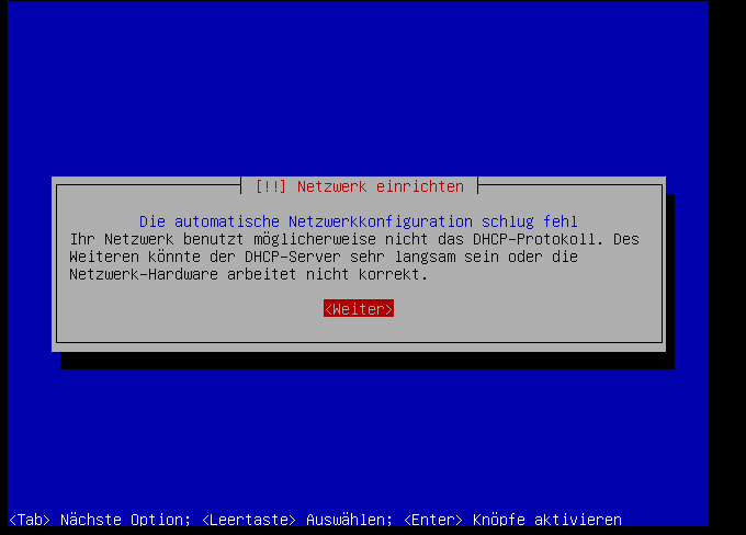 Wenn die Netzwerkkarte nicht per DHCP konfiguriert werden konnt, dann erscheint dieser Bildschirm: