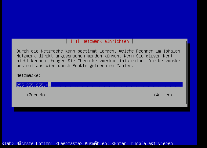 Jetzt muss die Netzwerkmaske noch eingegeben werden: