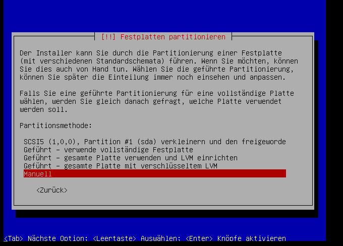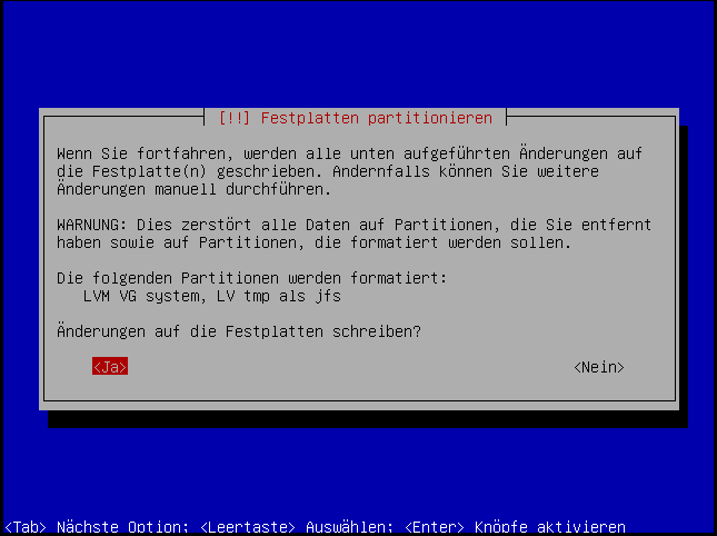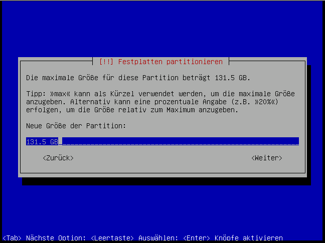 Hier ändern wir nix, da der gesammte Rest in die zweite Partition (LVM) soll: