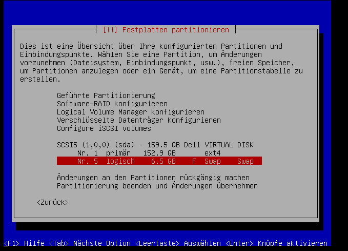 Jetzt geht es mit den Einstellungen der soeben angelegt Logischen Volumen weiter, zuerst nehmen wir uns mal das "swap"-Volumen vor: