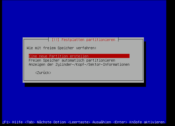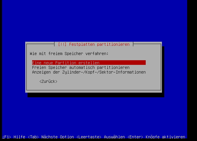 Jetzt ist die Platte leer, und wir können unsere Partitionen nach unseren Vorstellungen anlegen. Dazu gehen wir auf den freien Speicherbereich: