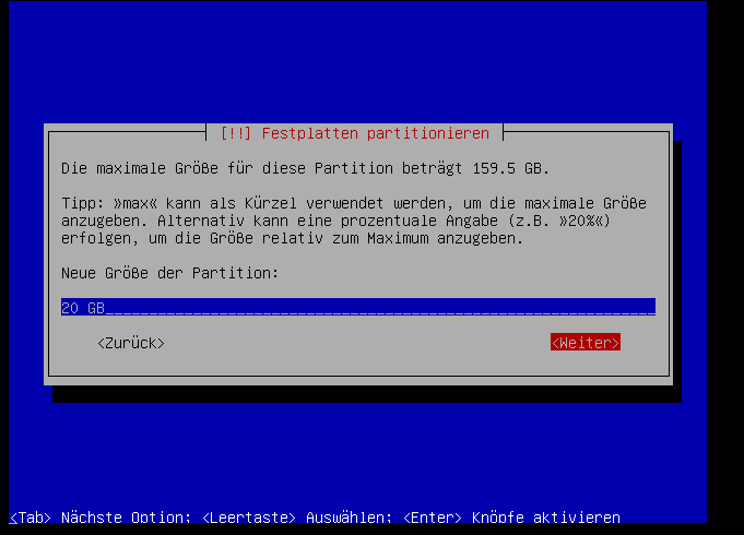 Die "root"-Partition kann zwischen 4 und 20 GB groß sein, da wir hier mehr als genug Plattenplatz haben, machen wir die mal 20GB groß: