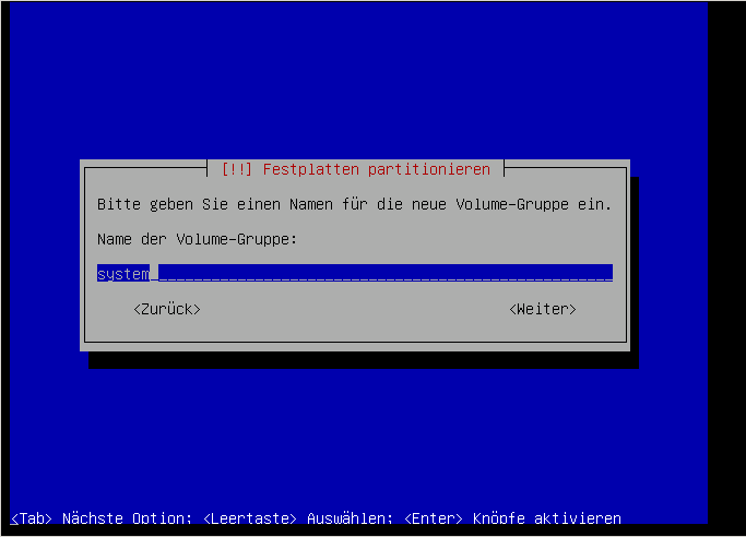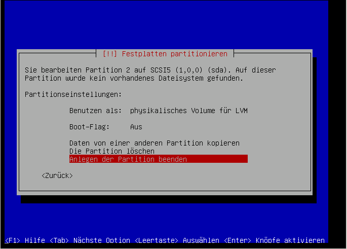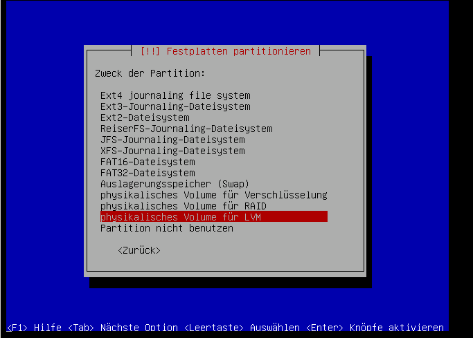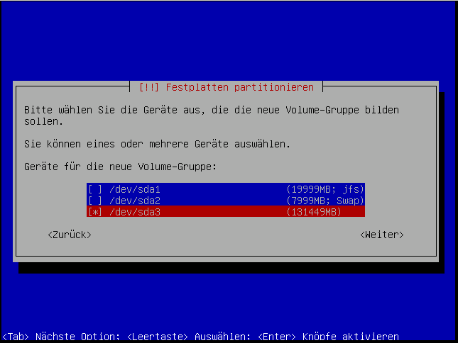 Hier muss die Partition, auf der die Volumen-Gruppe liegen soll ausgewählt werden. Das ist sicherlich für das Initialisieren des LVM nötig: