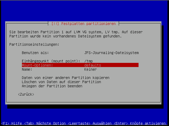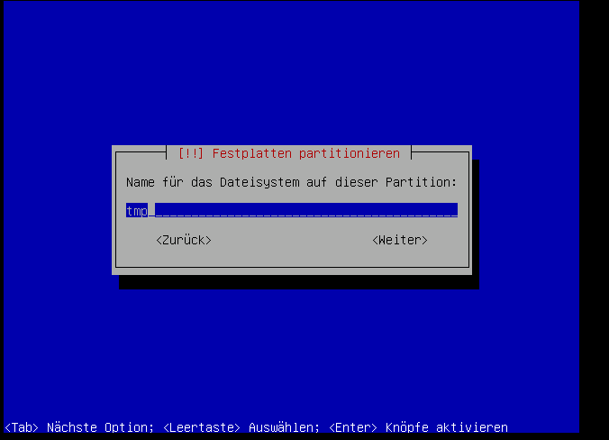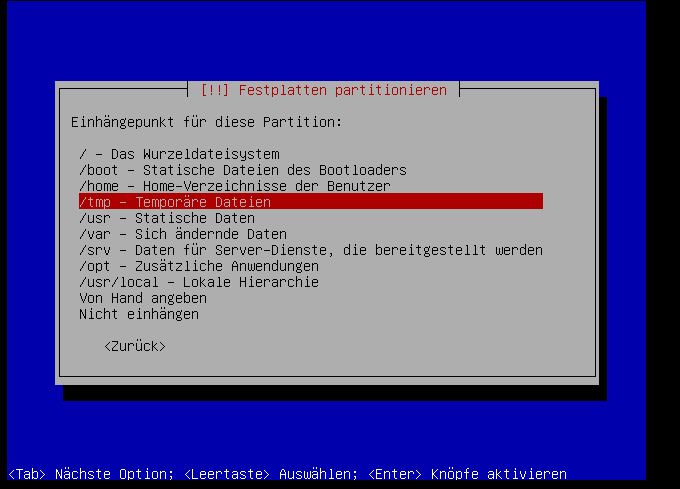 Wir lagern am besten den "/tmp"-Bereich auch in ein eigenes Laufwerk aus, da so das zuschreiben unserer "root"-Partition über diesen Weg verhindert wird und weil wir so aus Sicherheitsgründen über die Mount-Parameter das ausführen von Programmen und Scripten im "/tmp"-Bereich verhindern können.
