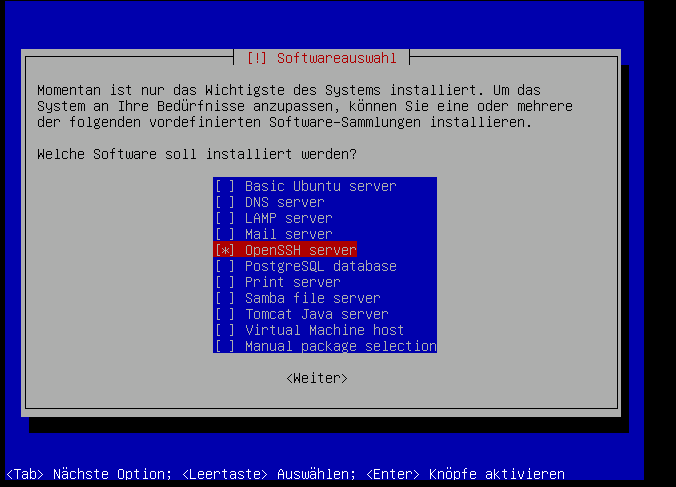 Der "OpenSSH-Server" ist ganz wichtig! Der soll nach dem Bootvorgang immer gestartet werden, sonst können wir uns nicht übers Netz einloggen: