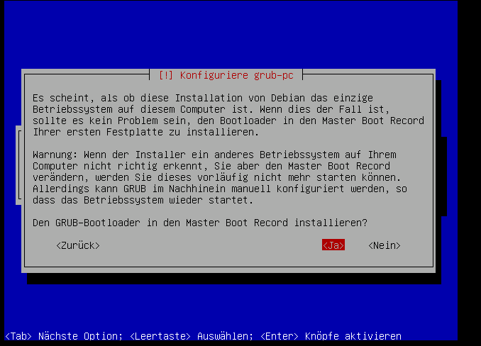 Da auf dem Rechner nichts anderes als dieses OS etwas zu suchen hat, können wir den GRUB absolut beruhigt in den MBR schreiben: