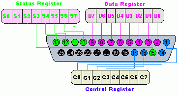- Mit dem Datenregister (befindet sich an der Basisadresse, z.B. 0x378) können acht Bit gleichzeitig auf die Datenleitung D0-D7 ausgegeben bzw. eingelesen werden (fals Bit 5 im Control-Register gesetzt ist).